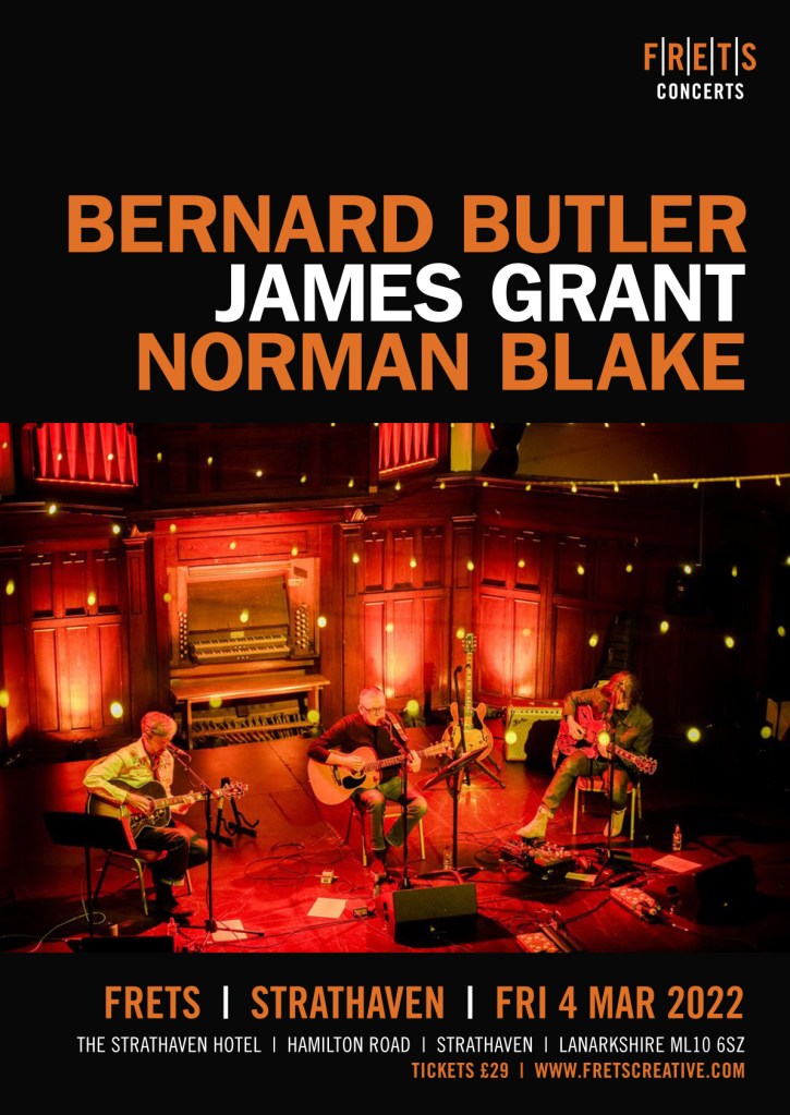 The next event in the FRETS calandar is Bernard Butler, Norman Blake and James Grant, who appear at the Strathaven Hotel this coming Friday 4th March. Anyone who was lucky enough to see Bernard, Norman and James at the FRETS at Celtic Connections concert in Glasgow (at St. Luke’s and Mackintosh Churches) will know how special these sold out concerts were. They played songs as a trio from their collective back catalogue from Suede, Teenage Fanclub, Friends Again, Love & Money and solo – they will be revamping their setlist for this concert, it’ll be their final performance of these FRETS curated concerts. There aren’t many tickets left – they are available at this link https://www.eventbrite.co.uk/e/norman-blake-bernard-butler-james-grant-tickets-264152606557 This will be a special concert.