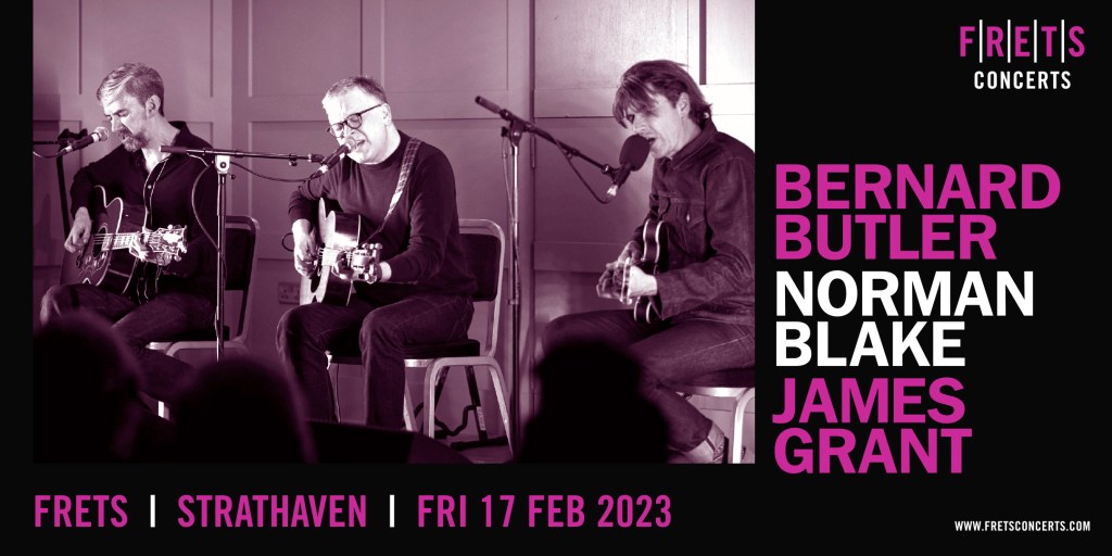 FRETS had the honour of bringing together the esteemed talents of Norman Blake, Bernard Butler and James Grant for acoustic concerts early in 2022. The concerts were fantastic, a major success with the public and critics alike. Norman, Bernard and James dipped into their collective catalogue (Teenage Fanclub, Suede, McAlmont & Butler, Solo, Friends Again, Love & Money) to present an acoustic show that delivered some joyous moments (patter included). FRETS is delighted to announce Blake, Butler and Grant will be returning to the Strathaven Hotel on Friday 17th Feb for their only Scottish date.