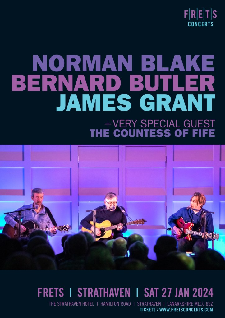 The first FRETS concert of 2024 with Norman Blake, Bernard Butler & James Grant at the Strathaven Hotel (with special guest The Countess of Fife) on Saturday 27th Jan is SOLD OUT.