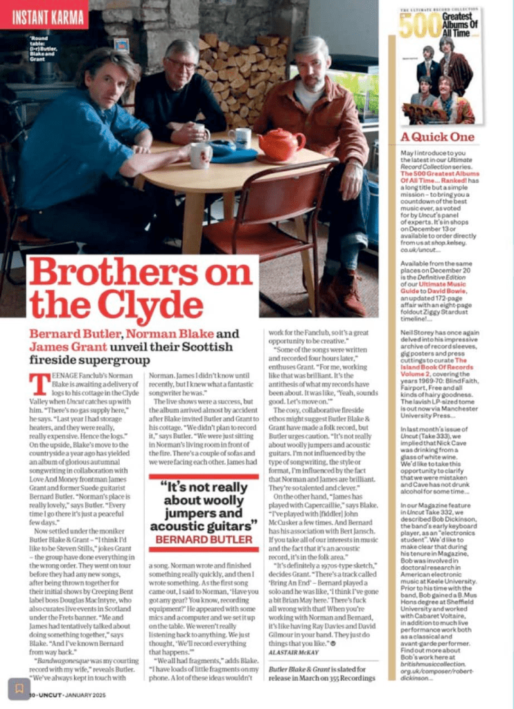 Bernard Butler, Norman Blake & James Grant will launch their debut album at FRETS on Saturday 22nd March with a live performance of songs from their album (and material from their back catalogue with McAlmont & Butler; Teenage Fanclub; Love & Money).