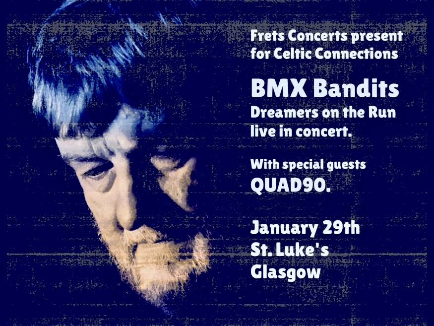 FRETS concerts start back with a run of shows we’re involved in at Celtic Connections in Glasgow. We present BMX Bandits in concert at St. Luke’s on 29th Jan, where they’ll celebrate their 40th year by performing their much acclaimed recent album Dreamers on the Run in full (with strings) followed by a set of their best loved songs from throughout theor career. QUAD90 will be on stage first as special guests performing songs from their forthcoming debut album on the Last Night From Glasgow label.