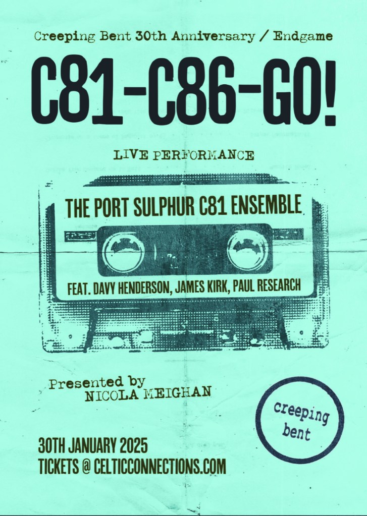 The Creeping Bent Organisation celebrate their 30th (and final) year with an event at Oran Mor on 30th Jan. The show is called CREEPING BENT 30 / C81-C86-GO!! and features the following: The Port Sulphur C81 Ensemble (with Davy Henderson, James Kirk, Paul Research); Mackenzies; The Cords; Katy Lironi; Grant McPhee & Nicola Meighan. TICKETS & INFO: https://www.celticconnections.com/event/1/creeping-bent-30-c81-c86-go-/