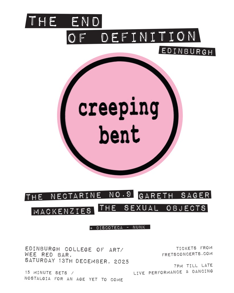 THE END OF DEFINITION (Edinburgh) will feature live performances by The Nectarine No.9, Gareth Sager, The Sexual Objects, Mackenzies, and disko by NUNK. Tickets go on sale at 7pm this Friday 10th Oct (which is when this link will become live):